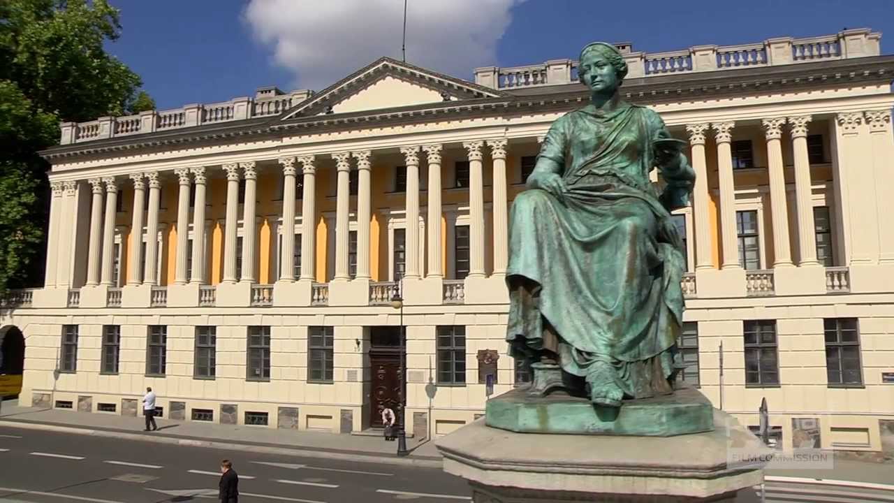 przedstawia fontannę Hygiei na tle klasycznego budynku Biblioteki